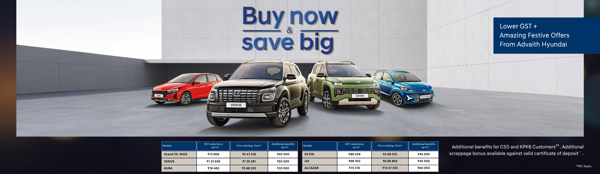 Find the best deals/offers on your dream Hyundai cars from World’s largest and most awarded Hyundai Dealer – Advaith Hyundai.Hyundai Offers / Discount includes Cash discount, Exchange offer, Corporate discount, and pride of India Offers, Hyundai Motor India / Advaith Hyundai reserves the right to change Offers / prices without prior notice.T&C Apply.