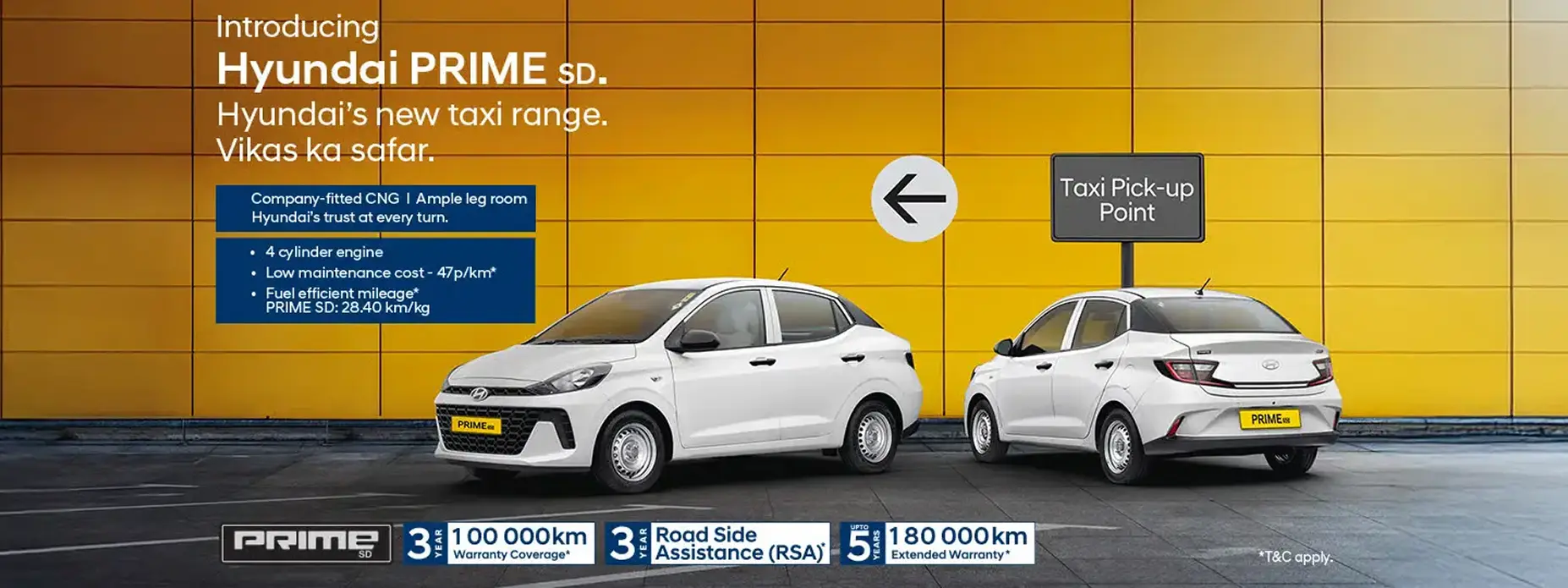 Hyundai PRIME SD is designed to power everyday mobility with maximum efficiency, comfort, and reliability. The PRIME SD blends Hyundai’s trusted engineering with low running costs, factory-fitted CNG technology, spacious boot space and premium safety features making it a smart partner for long hours on the road.