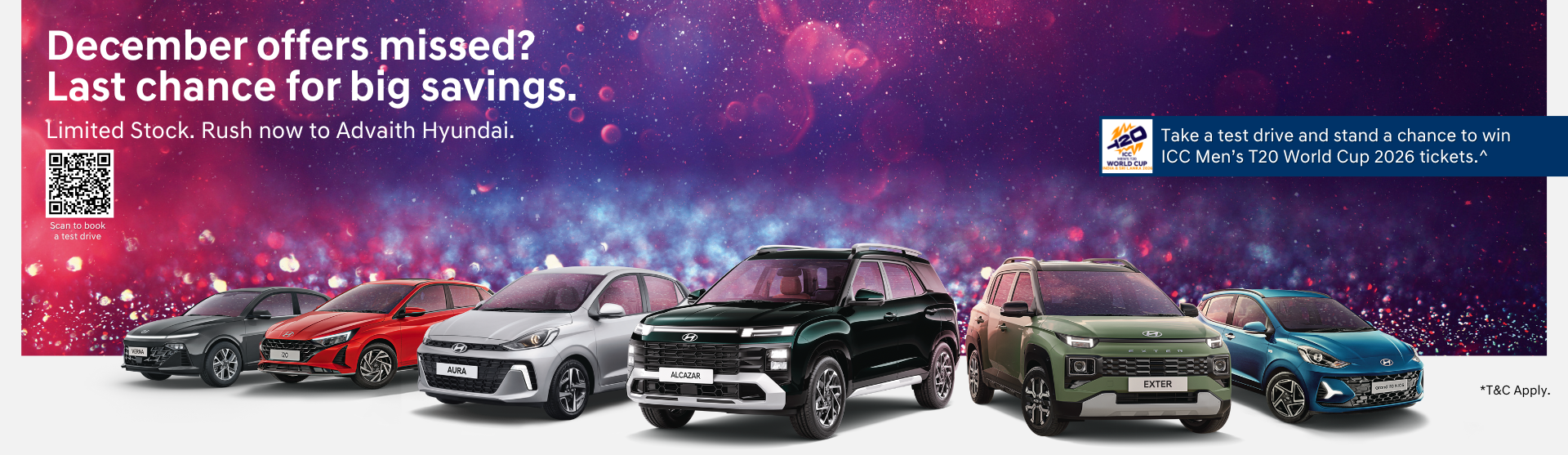 Find the best deals/offers on your dream Hyundai cars from World’s largest and most awarded Hyundai Dealer – Advaith Hyundai.Hyundai Offers / Discount includes Cash discount, Exchange offer, Corporate discount, and pride of India Offers, Hyundai Motor India / Advaith Hyundai reserves the right to change Offers / prices without prior notice.T&C Apply.